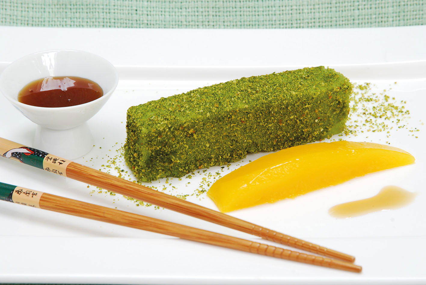 Rooster intussen het amandelmeel in een droge koekenpan tot het geurt en licht kleurt. Meng goed met de overige (1 theelepel) matcha. Keer de Warabi Mochi om (laat onder 1 hoekje even wat lucht komen). Snijd in mooie repen. Strooi het amandel-matcha meel er met een zeefje rondom overheen.